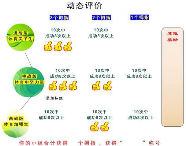又如笔者在执教水平二(三年级)《手球》第3课时《双手接球的练习方法 1》中,以小组学练的形式设置了捆绑式的进阶版的小组动态评价,以“原地双手接球(稳)”、“跳起双手接球(准)”、“其他方式双手接球(多)”三项螺旋向上的内容进行动态评价,让不同水平的学生通过学习、互助有效落实评价,促进学生学练激情。动态评价的形式为(下图):