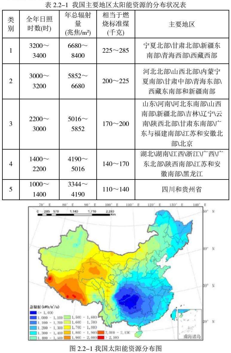 我国是世界上太阳能资源最丰富的国家之一,陆地表面每年接受的太阳能辐射相当于1.7万亿吨标准煤,我国太阳年总辐照量基本上在1050kWh/m²~2450kWh/m²之间,大于1050MJ/m²的地区占国土面积的96%以上。根据各地接受太阳总辐射量的多少,可将全国划分为五类地区,如表2.2-1《我国主要地区太阳能资源的分布状况表》、图2.2-1《我国太阳能资源分布图》。