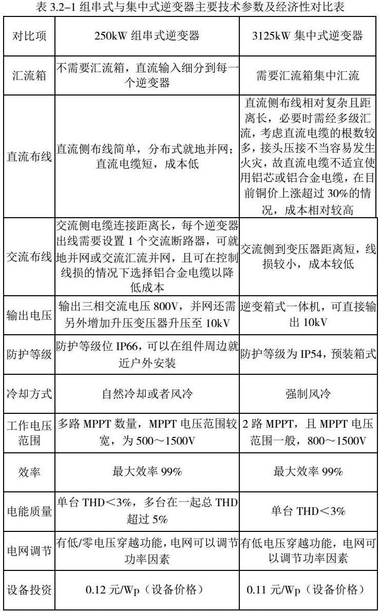 关于不同形式逆变器技术经济对比,本次选用组250kW组串式逆变器和3125kW集中式逆变器为例进行主要技术参数及经济性比较,具体参数如下: