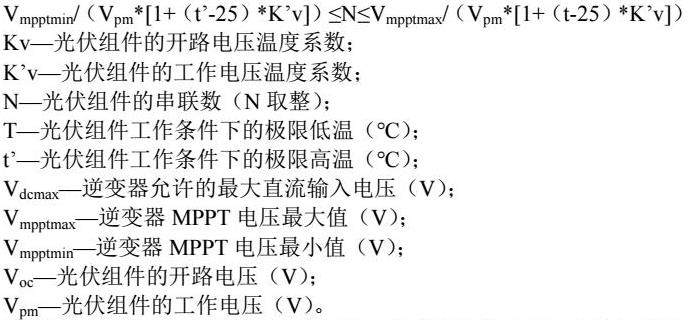 根据《光伏发电站设计规范》GB 50797-2012,光伏组件串串联数应按下式进行计算:N≤Vdcmax/(VOC*[1+(t-25)*Kv])