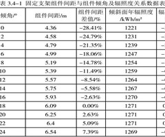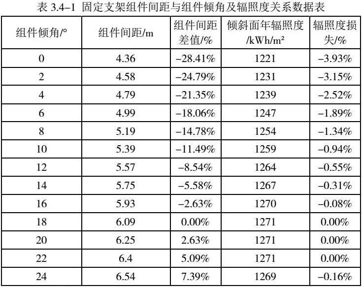 参考尺寸为2172×1303×35mm的组件,组件排列方式为固定式支架2行竖向布置,经计算,光伏组件串单元前后排最小净距与组间倾角的关系见表3.4-1。