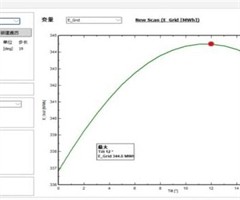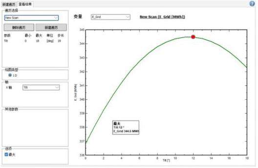 利用PVsyst软件优化工具,在间距6.2米条件下对一个光伏发电单元进行优化分析,可以进一步得到光伏阵列的发电量最大倾角,即最优倾角,如下图所示: