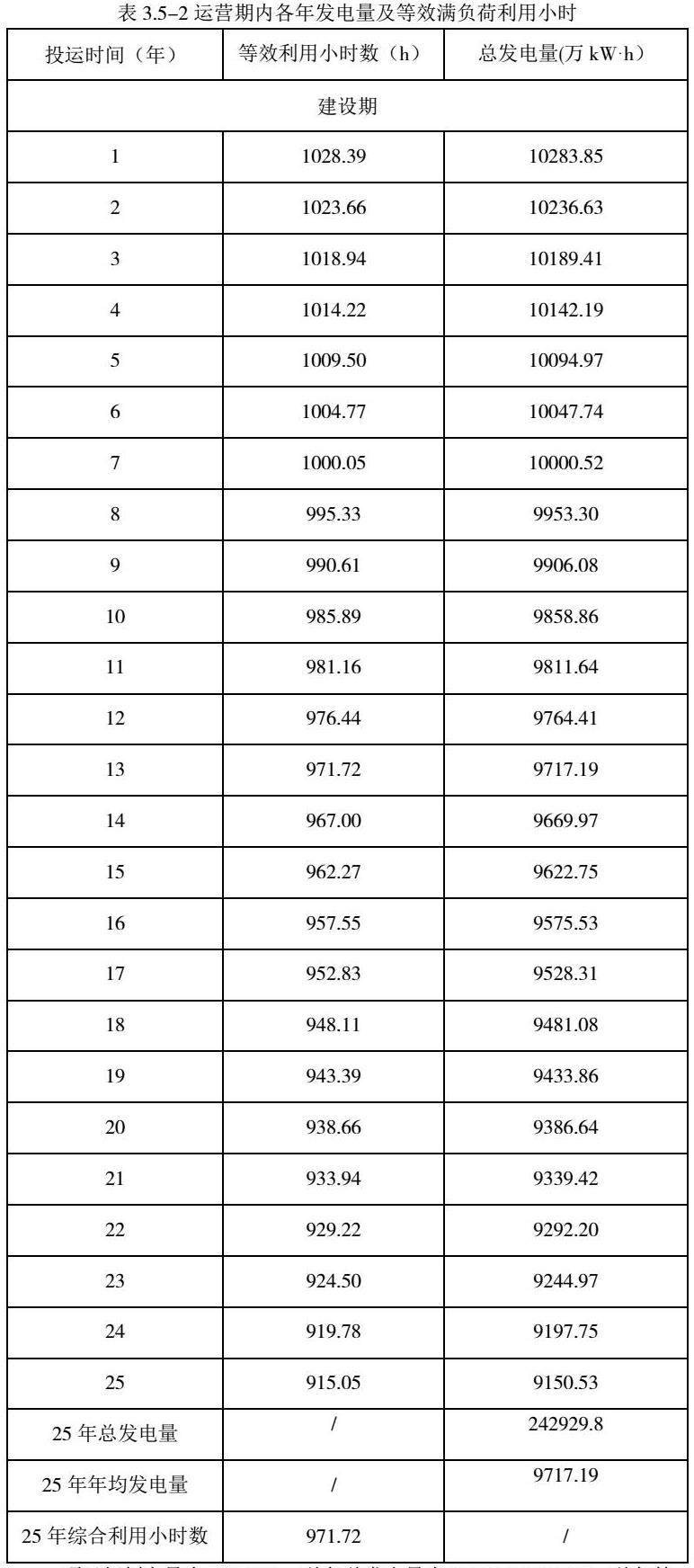 项目规划容量为100MWp,首年总发电量为10283.85万kWh,首年等效利用小时数为1028.39h。25年总发电量242929.8万kWh,25年平均发电量为9717.19万kWh,25年综合平均利用小时数为971.72h。