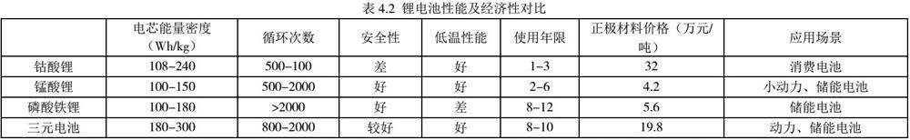 锂离子电池又分为磷酸铁锂、钴酸锂、锰酸锂和三元电池等。各类锂电池性能及经济性对比见表4.2: