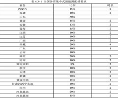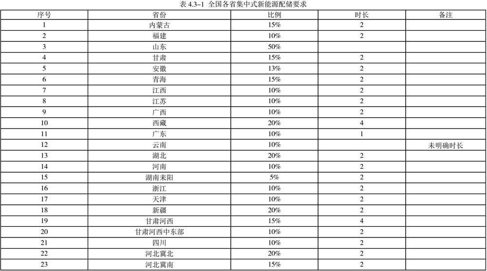 随着光伏新能源发展,全国各省逐步要求落实集中式光伏新能源项目配储工作,截止至2023年11月份,全国各省集中式新能源配储要求见表4.3-1所示: