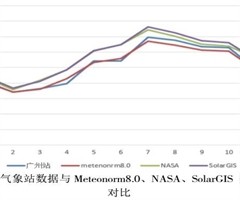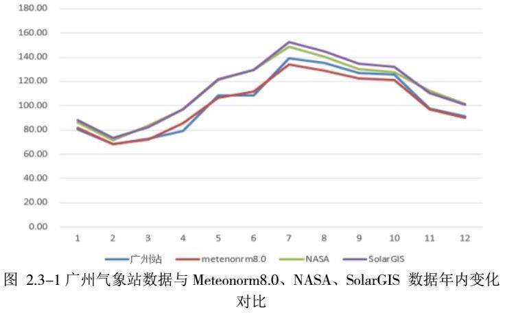 以广州边某地面集中式光伏项目为列,项目收集到的太阳辐照数据主要为广州气象站观测数据及Meteonorm8.0、NASA、solarGIS 的数据。通过对广州气象站数据和Meteonorm8.0、NASA、SolarGIS的数据进行对比,对数据可靠性进行检验。对比结果详见图2.3-1