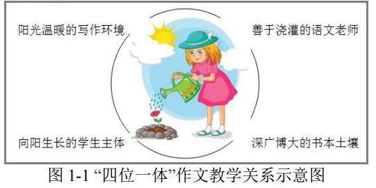 作文教学中四个元素不是孤立存在,它们彼此作用,推动写作活动的有效开展。笔者用一个简易的图画模型呈现这四者“四位一体”的关系(见图1-1)。