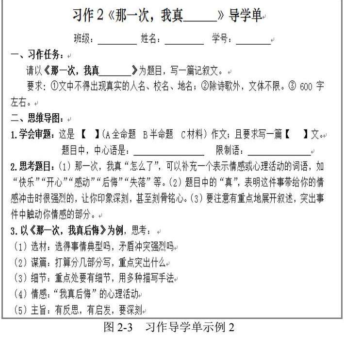 如“习作2《那一次,我真 》导学单”(如图2-3)所呈现的“思维导图”,首先强化了学生的命题作文文体意识,这个题目正是配合七上第二单元写作《学会记事》主题要求拟定的;其次要求学生再对题中填入的中心语(核心词)和题中限制词“真”的情感程度留心思考;最后通过《那一次,我真后悔》为例,启发学生关注选材、谋篇、细节、情感和主旨,完整撰写一篇立意深刻、情感强烈、事件清晰、细节突出的优秀作文。