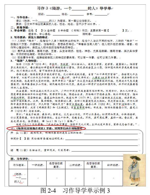 如“习作3《陆游,一个 的人》导学单”(如图2-4),这是配合“抓住人物的特点”写作要求,“思维导图”部分除了“学会审题”“写作要求”“人物标签”等辅助内容外,笔者还特别将“探访陆游纪念馆”项目化学习融入其中,带着这个作文题探访场馆,让同学们去亲身经历获取自己想要的答案与信息。