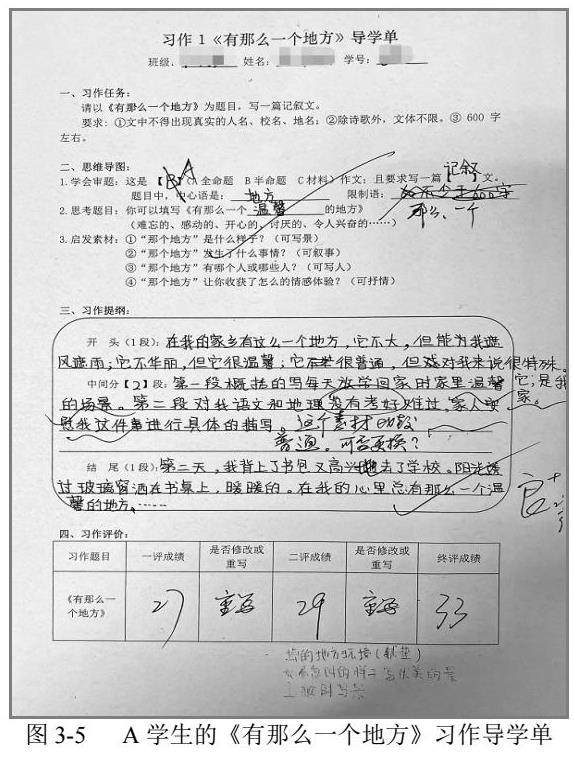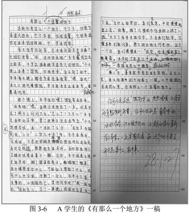 在导学单基础上,学生开始写作一稿。完成后笔者要求学生将导学单贴在一稿作文的前面,统一上交由笔者开展统评。因为有提纲为引,学生在写作时就有“纲”可依,写作过程较为顺利。而老师在评改中,因可参看前面的学生提纲,也能及时发现学生写作中的问题。如会发现学生文章与提纲相去较远的情况。还会发现有些学生的文章和题目之间尚存在理解上的偏差,如以A学生的作文为例(如图3-6),该同学没有围绕“地方”来写,而只是记了这个地方的一个人、一件事。