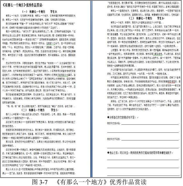 当“一评”成绩出来后,会有几位同学的作文脱颖而出,这时笔者会将这些学生的作文电子稿集结成一张“优秀作品赏读”文档(如图3-7),印制出来并开展“学生自评互评一稿”作文点评课。通过小组讨论、交流,学生点评作文的亮点与不足,同时学习他人的优点与长处,进一步明确二稿修改的方向。