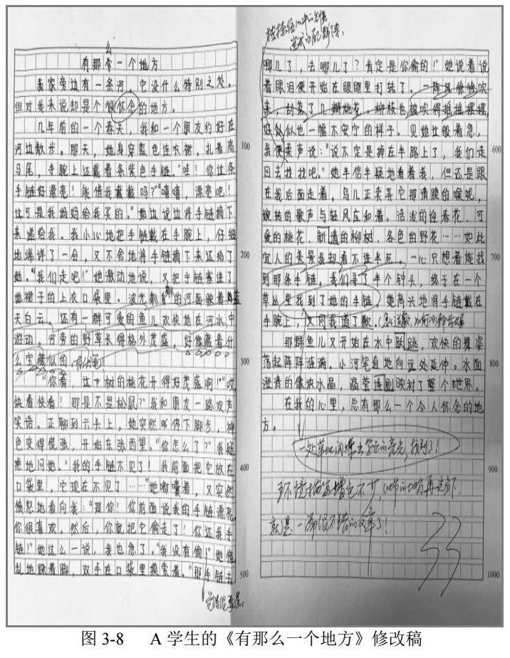 在经历“二评”后,再完成修改二稿,统一上交由老师进行二稿追评,即终评。不少学生的文章已经“脱胎换骨”,可以说整个写作到这里才是一次完整的闭环。还是以A学生为例(如图3-8),看看她的明显变化,她不仅更换了选材,而且全文还紧扣“地方”作文章。当然还有些学生未能通过两轮修改达到文章最满意的状态,也不要紧,也无需再进行打磨,他的问题需要下一次写作活动继续改良、强化、提升和巩固。
