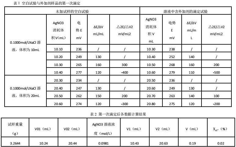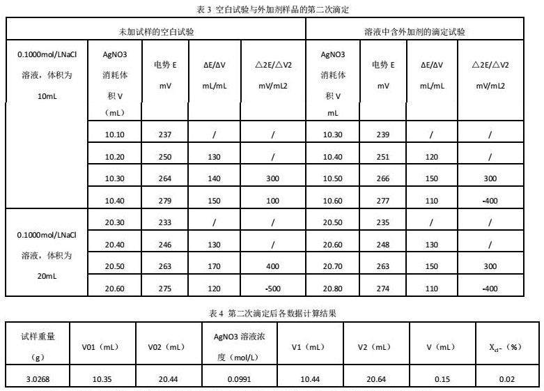 从表2和表4中可以看出,两次滴定后氯离子计算值均为0.02%,因而混凝土外加剂中的氯离子含量为0.02%。
