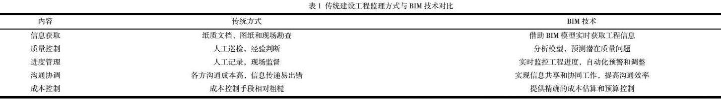科技的进步和建筑行业的不断发展,向工程监理工作提出了更高的要求。传统的工程监理方法低效且繁琐,早已不再适用于当今的建设工程(见表1)。BIM技术以其可视化、模拟性和协调性的优势,正在逐渐改变着工程监理的工作模式,也是数字化信息技术在工程监理方面的一大变革。BIM技术通过构建三维数字化模型,实现了工程的全方位可视化,便于监理人员直观地了解工程项目进展,开展高效的监理工作。统一信息平台的搭建整合了各种工程信息,并实时更新,不同部门之间得以共享动态信息,提高了监理人员信息获取的效率和深度。具体而言,在设计阶段,不同设计部门的专业人员借助统一的设计平台,打破了团队之间的沟通阻碍,实现了协同设计。施工阶段,BIM模型直观地展示了工程结构,帮助施工人员更好地理解和执行施工方案。BIM技术模拟了施工过程,监理人员可以提前预知风险环节,更加清晰地了解施工过程中的难点和重点,从而将工作重心放在施工的关键阶段。不同维度的模型实现了不同管理目标的动态跟踪,便于风险识别和控制。在竣工时,BIM技术的使用为工程结算提供了更多便捷,避免了传统结算方式中的繁琐和错误,能有效维护相关人员的利益,避免资金纠纷。