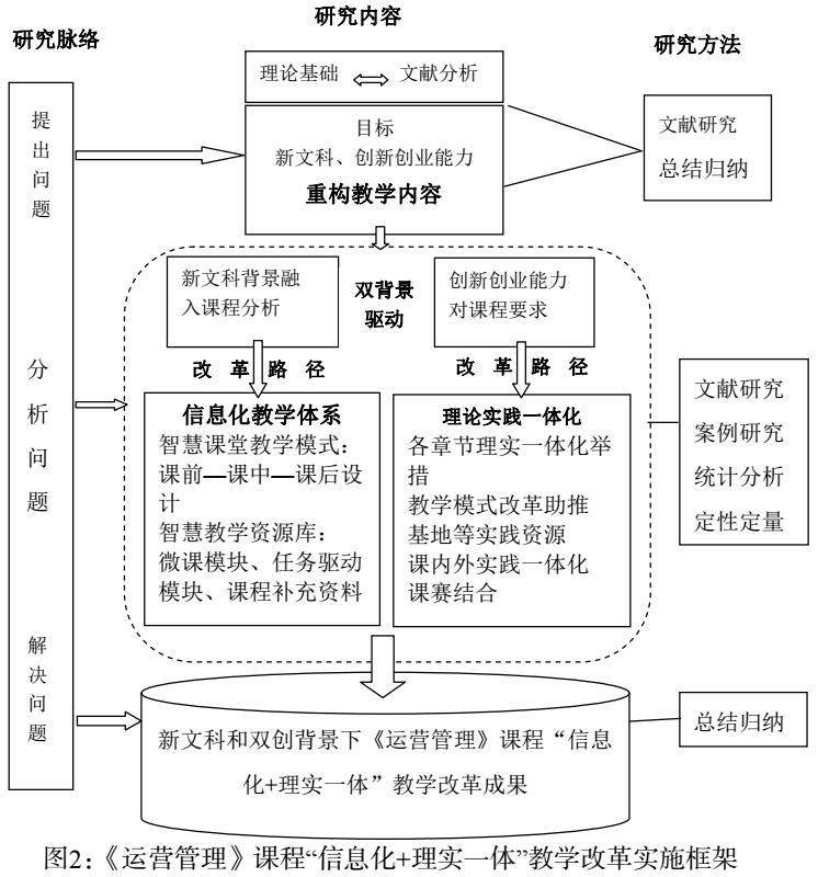 本课程教学改革基于提出问题、分析问题和解决问题的研究脉络,针对现状分析,提出基于新文科和双创背景的教学目标调整,融合思政目标,以及教学内容的重构;分别针对新文科背景和双创背景在信息化和理实一体进行整个课程教学的改革,具体框架见图2。