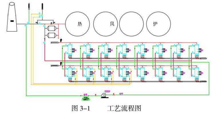 工艺流程一:热风炉烟气双预热器后烟气总管→脱硫装置→主抽风机→净烟气总管返回原热风炉烟道旁路阀前烟气总管→烟气烟囱排放+烟气送喷煤制粉。
