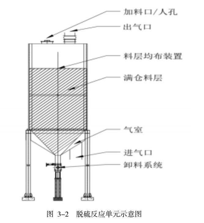 脱硫装置由脱硫反应单元组合。脱硫反应单元采用模块化设计,根据烟气量和污染物浓度配置数量,多个脱硫反应单元并列紧密排布,根据场地空间多层布置。单个脱硫反应单元由金属壳体、料仓、料床、卸料阀、进烟口、排烟口等组成。内部料床采用透气挡料板,保证烟气自由流动的同时,吸收剂一直固定在床层中,不随烟气移动,不会增加烟气含尘量。随着烟气自下而上的流动,SO2、粉尘不断地被吸收,烟气中的SO2、粉尘浓度逐渐下降,钙基脱硫剂逐渐饱和。同一批钙基脱硫剂进入料床后,反应饱和程度在烟气的流动方向上呈现逐渐降低的趋势,根据实际使用情况换料,通过物料重力自上而下的运动,将料仓底部已饱和的失活脱硫剂先排出仓外,新鲜的脱硫剂通过加料斗加入固定床内部。
