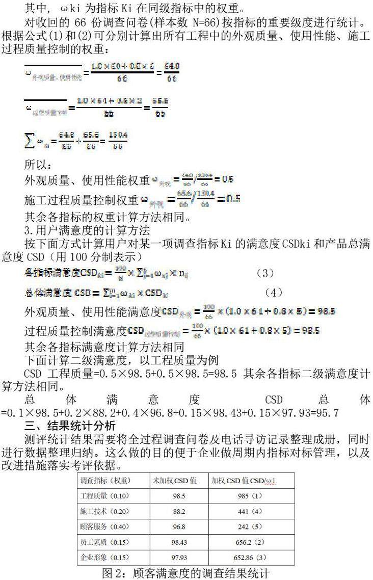 从上述举例得到的结果表明,该企业总体满意度95.7分,其中在工程质量、员工素质、企业形象方面最为满意,施工技术方面也很满意,但是顾客服务仍有欠缺,仍需改进。工程质量方面,顾客满意度分值高。这说明工程质量还是比较稳定的,颇受好评。今后的工作重心要充分地与业主沟通,交换不同的意见,把所有疑问提前处理解决,保证施工过程的顺利进行。