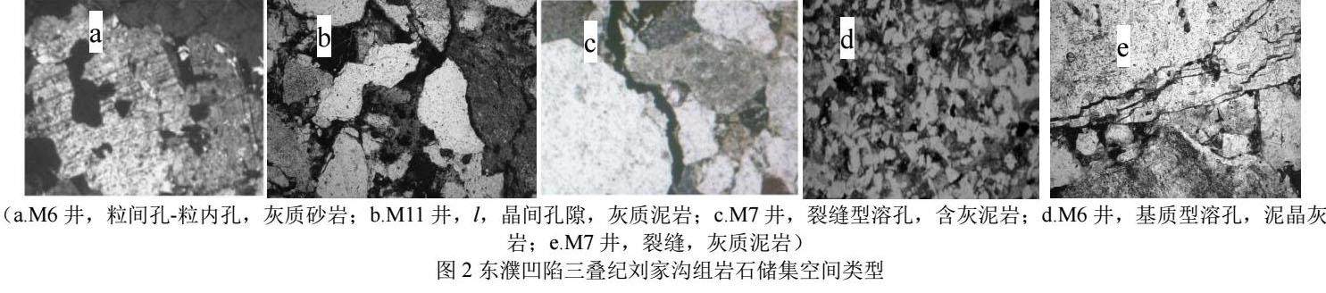 (1)东濮凹陷三叠纪刘家沟组储层为碳酸盐岩、火山岩及碎屑岩纹层状、细粒混积,岩性主要为泥岩、泥质灰岩、泥质白云岩和凝灰岩。储集空间以碎屑粒间孔—粒内孔、火山灰脱玻孔以及长英质溶蚀孔、溶蚀缝为主,孔隙度集中在5%左右,渗透率大多低于0.1×103μm2,为一套岩性复杂、孔隙类型多样的低孔、特低渗致密储层。