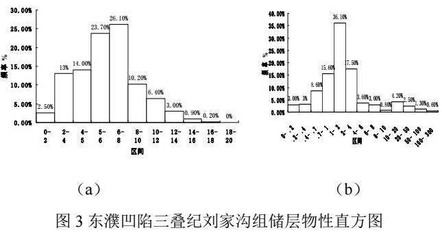 刘家沟组22口井1840块岩心孔隙度分析结果显示,其孔隙度整体较低,约80%的样品孔隙度小于10%,孔隙度小于5%的样品占一半比例(图 3a)。894块岩心渗透率测试结果显示,渗透率低于4×103μm2的样品占比高达82%,渗透率低于2的样品接近66%(图3b),去除典型的溶蚀及裂缝样品,渗透率高于10×103μm2的样品很少,为典型的低孔、特低渗储层物性特征。