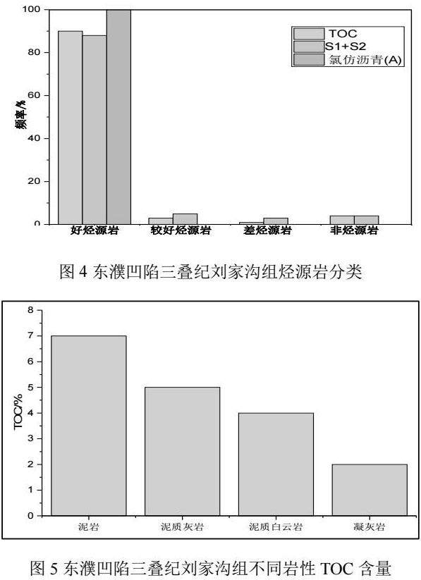 通用的陆相烃源岩有机质丰度评价标准(表1)将烃源岩类型分为好、较好、较差以及非烃源岩4类。根据该标准结合有机质实验分析结果,东濮凹陷刘家沟组90%以上的烃源岩有机质丰度属于好的类型(图4)。在4个有机质丰度评价指标中,TOC直接测量沉积岩中与有机质有关的碳元素,是烃源岩丰度评价最重要的指标。该组内烃源岩岩性分泥岩、泥质灰岩、泥质白云岩和凝灰岩,其TOC实验分析平均值分别为6.9%(151块样品)、5.4%(151块样品)、3.8%(151块样品)和2.3%(21块样品),如图5所示。由此可见,东濮凹陷刘家沟组烃源岩好,有机质丰度高,且烃源岩的优势岩性为泥质白云岩和泥岩,泥质白云岩和泥岩为主要生油岩。