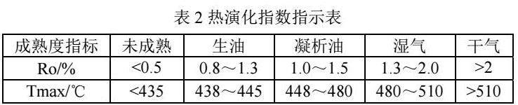 评价有机质成熟度常用方法有镜质体反射率法、岩石热解法、抱粉和干酪根的颜色法、可溶有机质的化学法等,后3种方法在东濮盆地分析样品少,难以建立有效的地球化学剖面。其中,Ro是应用效果最好的指标,其次为Tmax,且这2种参数样品资料丰富。Ro可用来划分有机质演化阶段、确定有机质成熟度、判断油气深成带、说明盆地的构造史、区分原生和再沉积的镜质体及发现剖面中的火成岩体。随成熟度的增高,烃源岩生成的油气越来越多,Tmax逐渐增大,故也可用Tmax来判断生油岩的成熟度。相关研究认为有机质在排烃之前会生成大量有机酸液,排烃的阈值处于Ro为0.5%附近,Ro小于0.5%时,有机质处于未成熟阶段;Ro在0.5%~1.3%之间,为有机质的成熟阶段,是石油的生成带;Ro在1.3%~2.0%之间,为高成熟阶段,是湿气和凝析气的生成带;Ro大于2.0%时,属于过成熟阶段,有机质只能生成干气(表2),三叠纪刘家沟组高丰度烃源岩释放的有机酸液为储集层易溶组分(长英质)的溶蚀创造了有利条件。