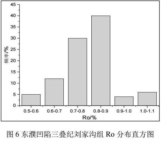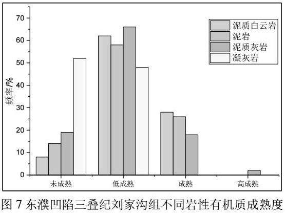 不同岩性的有机质成熟度分布范围分析表明,组成刘家沟组烃源岩的岩性有机质成熟演化程度基本都在低成熟和未成熟阶段,部分在成熟阶段。其中,泥质白云岩(405块样品)和泥岩(292块样品)低成熟和成熟部分所占比重较大,达90%以上,泥质灰岩(26块样品)和凝灰岩(44块样品)以低成熟和未成熟为主。总体来看,刘家沟组有机质热演化程度主要以低成熟为主,其次为成熟和未成熟,泥质白云岩和泥岩类的成熟度较高。