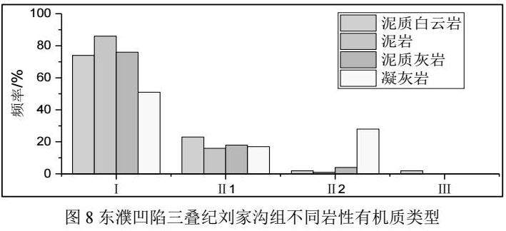 总体来看,刘家沟组烃源岩生烃潜力极强,泥岩、泥质灰岩、泥质白云岩和凝灰岩均具有较好的生油能力(图8),其中泥质白云岩和泥岩有机质类型Ⅰ型和Ⅱ1型相对泥质灰岩和凝灰岩占比更高。在热演化程度方面,烃源岩主要集中在生油阶段,Ⅲ型部分处于未成熟阶段。