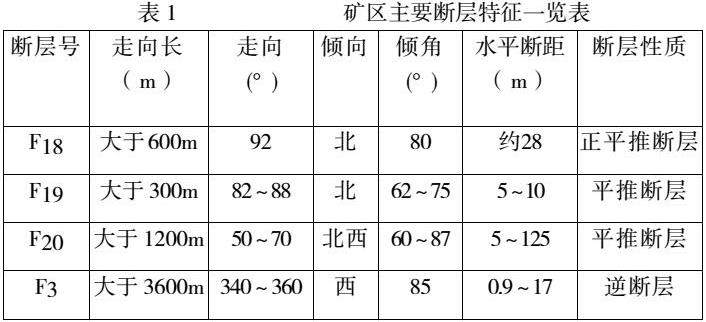 矿山内断裂构造发育,断裂构造纵横交错,按其展布方向,主要有一组走向近东西向的平推断层,也见有走向近南北向的逆断层(F3)由南延伸至矿山内(见表1)。