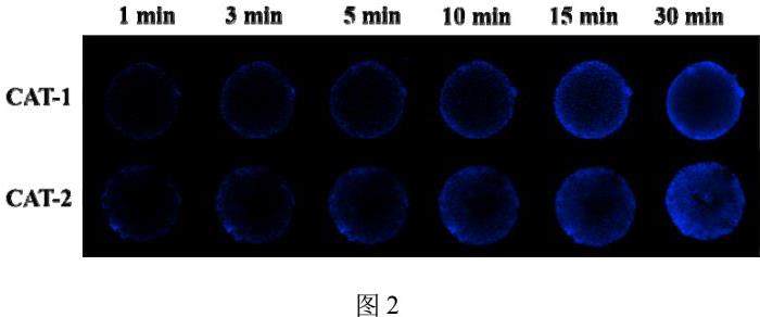 通过搭建实验平台,实现传质扩散性能的观测。如图1,选择两种不同基质材料的催化剂,加入菲并咪唑衍生物[7]作为探针分子,记录30 min的图像。为了,确保实验的准确性,每种催化剂选50个。