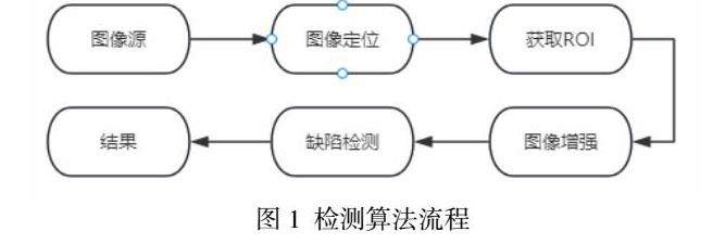 本文检测算法基于海康威视的Vision master平台实现,原图像为1096 x 1024像素,具体检测流程如图1所示: