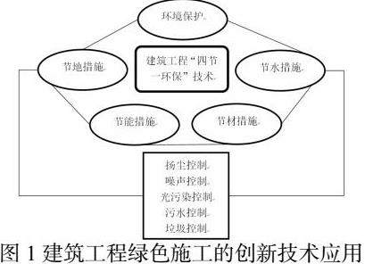 充分考虑施工材料的利用与可循环,运用科学的管理模式对施工材料进行分析评估处理。结合绿色管理理念,对施工现场出现的废弃物进行有效控制处理,例如,工程施工现场,对废水废气的控制,对于扬尘的控制,都要运用检测设备给这些污染做出评估,并结合运用科学现代化设备,对污染物进行合适的处理与处置,以免影响环境,切实运用施工管理技术来落实绿色环保管理理念。建筑工程绿色施工的创新技术应用如图1所示。