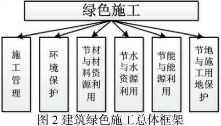 在确保其质量符合标准质量要求的同时,建筑施工管理人员应当对节约能源方面有充分的评估,对建筑施工中每一个流程都要有评估,再结合评估结果,在技术方面对建筑各项功能细节化处理给予完善的技术支持,以此提高建筑施工建筑的整体功能。在建筑施工过程当中,为了减少施工造成的污染,可以运用绿色施工技术,加强对粉尘管理以及对噪声污染控制。例如,对于施工过程中的飞尘,可以设置专业隔离设施,也可以对粉尘区域进行流水冲洗,可以减少粉尘对周围居民的环境污染。对于控制噪声污染方面,可以选用先进的静音设备减少噪音,以维护周围居民的安静舒适生活。建筑绿色施工总体框架如图2所示。