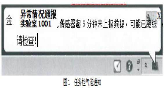 实现该功能核心思想在于及时、准确传达信息,否则系统将失去即时性。客户端程序有周期为1s的定时器,每次触发时,客户端对日志表发起一次查询,若产生新日志,则以任务栏气泡、置顶对话框双重方式行异常通报,旨在使实验室管理人员能及时响应。.NET框架提供的Notifylcon类为App提供了在任务栏托盘创建图标的方式,用ShowBalloonTip()可显示气泡通知,如图1所示。