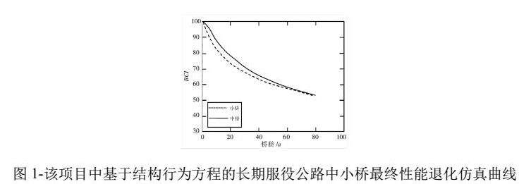 对于结构行为方程模型下的长期服役公路桥梁性能退化仿真数据,具体处理时,研究者还需要再次通过统计软件对其实施分组处理,之后再实施回归分析,如此便可对结构行为方程中的各个参数做出合理标定,最终完成长期服役公路桥梁性能退化仿真曲线绘制。在此基础上,研究者需继续对中桥和小桥分组数据实施进一步的回归分析,以实现其各个参数结果的合理标定,并根据最终的标定结果,完成小桥和中桥结构最终的性能退化仿真曲线绘制。图1为该项目中基于结构行为方程的长期服役公路中小桥最终性能退化仿真曲线: