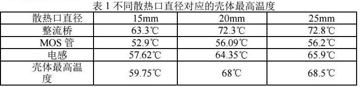 环境温度为25℃,在散热口直径为15mm、20mm及25mm时,瞬态仿真总时间设置为3600s(模拟环温1h),控制器各功率器件及控制器壳体的最高温度数据见表。控制器系统最高温度为72.8℃,功率模块整流桥、MOS管及电感及与其接触的周围壳体的温度较高,存在热耦合区域。由壳体部分的温度分布情况可以看出,壳体导热情况良好,说明因功率损耗造成的发热量在结构件之间进行了充分传导散热。