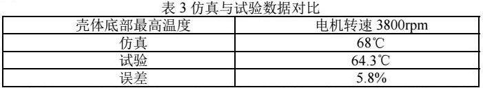 环境温度25℃,风口直径20mm,散热齿厚间隙比为0.5时,搭建试验平台。试验条件与仿真条件保持一致,利用手持热成像仪对试验中控制器壳体底面的温度进行了监测。控制器工作1h后,控制器壳体外壳仿真及试验的最高温度如表所示。