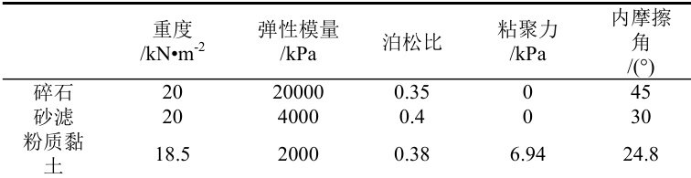 本文计算采用填筑坝体,分三个阶段施工,各个施工阶段的填筑高度分别为:2m;2m;2m;1.7m。整个坝体由7.7m的碎石层构成,下铺1.5m的砂滤层,砂滤层下有淤泥粉质黏土 13m 。考虑到计算边界范围对于分析结果的影响,左右坡脚向外延伸 20m 。