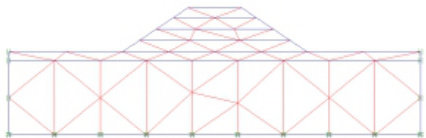整个坝体的建筑通过三个施工过程完成。第一,二,三施工过程填筑2m;第四个施工过程填筑 1.7m 。有限元模型及网格如下图1 所示。
