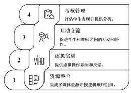 结合前文选取的多媒体教学平台、虚拟仿真技术、在线学习平台,打造教学平台,融合资源整合、虚拟实训、互通交流、考核管理四大功能。如图2: