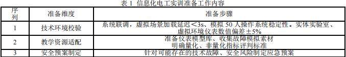 基于信息化开展电工实训前的准备工作,应覆盖技术环境校验、教学资源适配,安全预案制定。具体实训准备内容可参表1: