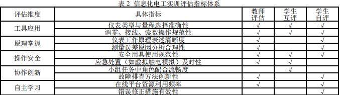 结合“教师评估+学生互评+学生自评”三合一评估体系,设计表2信息化电工实训评估、指标体系: