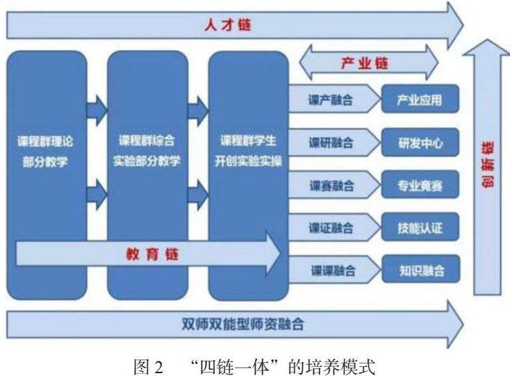 针对课堂教学内容无法满足当前企业市场需求的情况,邀请本行业的合作单位,兄弟院校等一起探讨,共同修订新的人才培养方案。开创新的“四链一体”的培养模式,以人才链为主线,以教育链为主体,以创新链为导向,与产业链相结合努力培养出符合市场需求的人才,如图2所示。同时,合理安排相关课程的行课结构和行课顺序,使学生更加深入的了解整个课程体系,提升学生的工程实践能力和学生的创新思维能力。