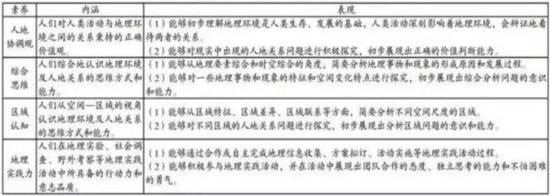 2022版地理新课程标准与之前的课程标准相比实现了突破和变革。在课程目标上,课程标准突破以往“三维”限定课程目标(知识与技能、过程与方法、情感态度与价值观三方面来表述的“三维”目标),基于人地协调观、综合思维、区域认知和地理实践力四大核心素养提出四大方面培养目标,建立以核心素养为导向的新型育人方式和培养模式。新课程标准中所涉及的核心素养的内涵和表现如下: