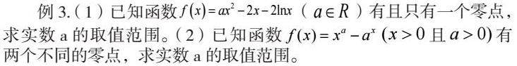 例3.(1)已知函数()有且只有一个零点,求实数a的取值范围。(2)已知函数且有两个不同的零点,求实数a的取值范围。