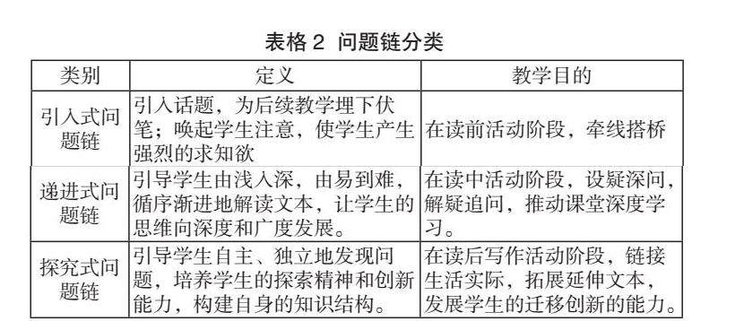 以读促写课的文本解读要从语篇出发,通过设置不同层次的问题链的方式,引导学生进行探究式学习,对语篇进行深入思考,帮助学生梳理理解文本内容,为写作活动积累写作素材,为写作目标的达成做好语言铺垫。在英语学习活动观视角下的英语语篇解读,需要从学习理解、应用实践、迁移创新三个方面切入,设计引入式问题链、递进式问题链和探究式问题链(见表格2)。不同类型的问题链可以满足课堂不同的教学目标,凸显英语学习活动观指导下的初中英语读写课堂活动的丰富性和层次性,提高读写课的教学效果。