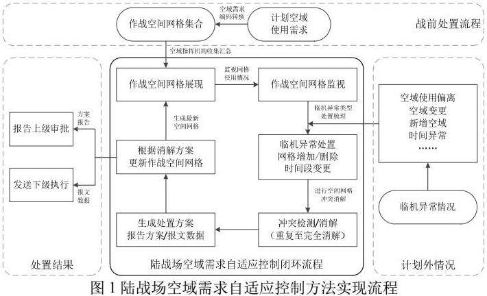 空域需求自适应控制[1]主要是指在作战过程中,指挥机构依据空域使用筹划的结果,督促指导和约束限定各部队对空域的使用,使其在限定时间和空间范围内,按照时间次序遵循一定的规则与关系,相互配合,安全、有序、高效地使用空域,同时针对战场异常情况具备自适应调整和针对性处置的能力,推进作战进程实现既定作战目标。