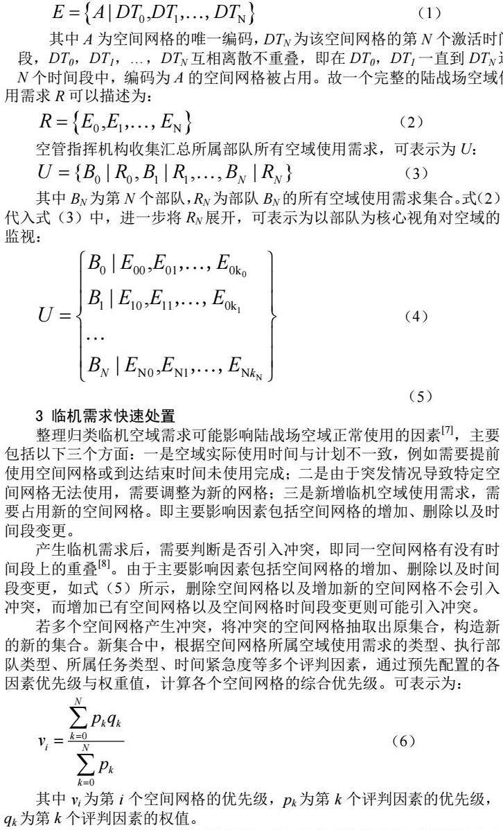 临机需求快速处置:整理归类临机需求对陆战场空域正常使用的影响因素,主要包括空间网格的增加、删除以及时间段变更,当临机需求产生了空域冲突后,根据优先级因素对冲突的空间网格进行优先级计算,根据计算结果自适应处置临机需求带来的冲突。