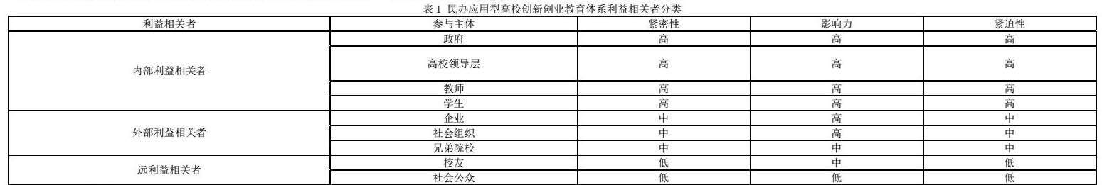 本文认为,创新创业教育体系存在多层次结构(微观、中观、宏观),多主体参与(高校、政府、企业、师生、社会公众等)和多形态互动(单双向结合、虚实结合、个人和团队结合)的显著特征。为了观察生态系统内部各参与方的复杂互动关系,本文引入管理学的利益相关者理论,并结合Sirgy[9]、Mitchell[10]、贾生华[11]等人的研究,将民办应用型高校双创教育体系的利益相关者划分为三种类型(内部利益相关者、外部利益相关者、远端利益相关者)和三种属性(紧密性、影响力、紧迫性),如表1所示。