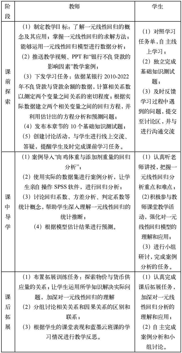 下面以统计学课程中的“一元线性回归”为例,详细介绍基于蓝墨云班课的《统计学》课程线上线下混合式教学活动的过程,详见表1。